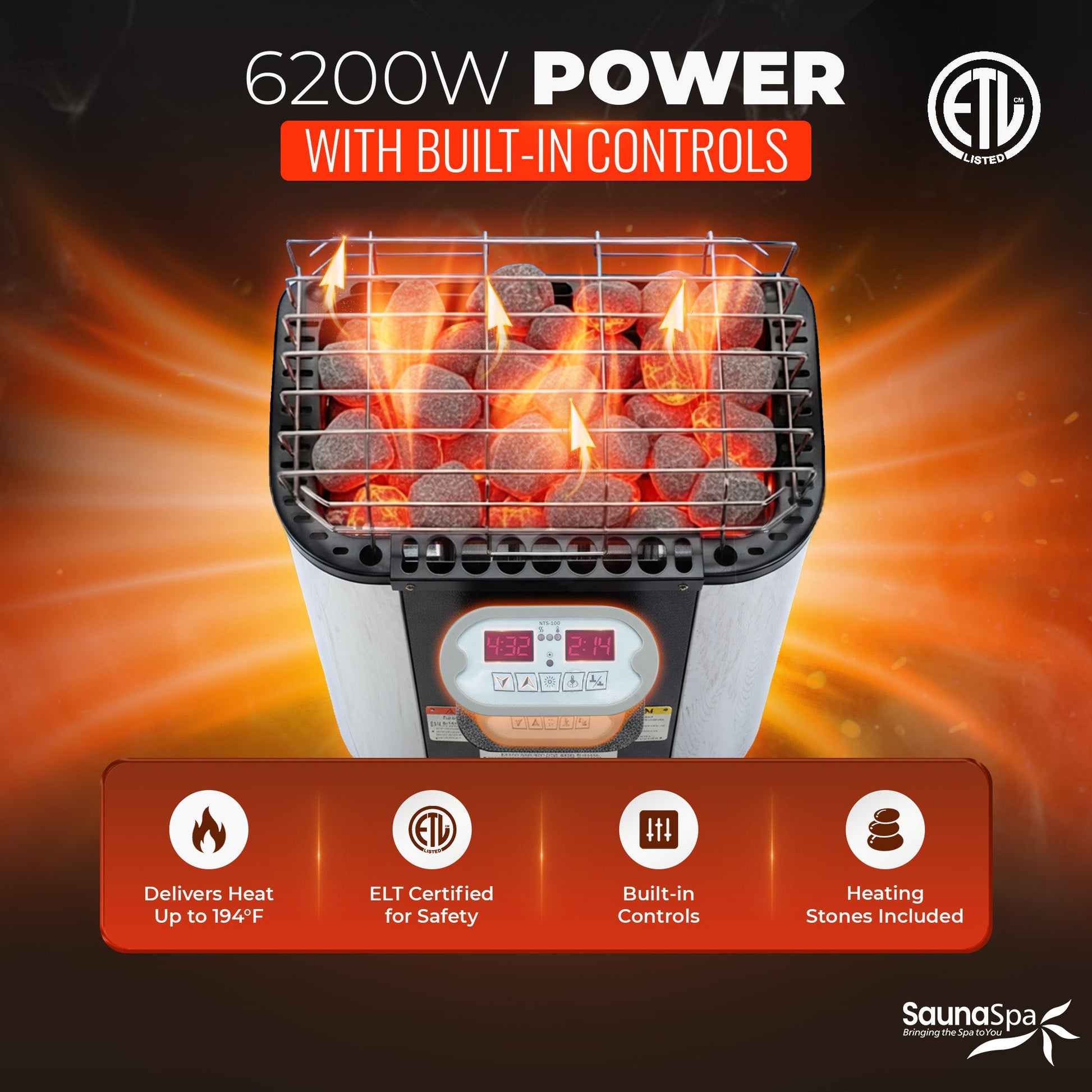 6.2KW ROCK HEATER: ETL-certified sauna rock heater provides authentic wet sauna heat up to 194F (set temperature: 158F-194F)